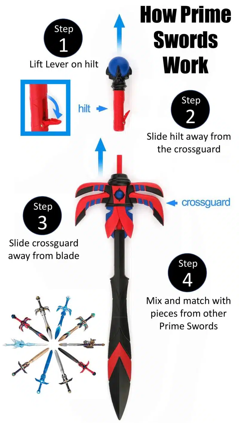 Prime Swords are truly unique toy swords! Unlike other foam swords, you can easily mix and match any of the 3 pieces that make up the swords – the blade, the cross guard (the middle section of the sword) and the handle – with any other Prime Sword, regardless of their design or color, for the ultimate personalization! ? To customize, simply lift up the little lever on the grip and slide the different pieces off of the blade core (the plastic piece running through the foam blade). Choose any style and color of pieces then slide the pieces onto the blade core so that the pieces are tightly touching and easily close the lever. Once the lever is closed the sword pieces are locked into place!